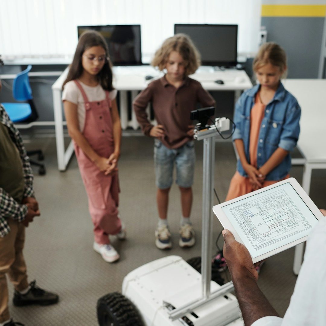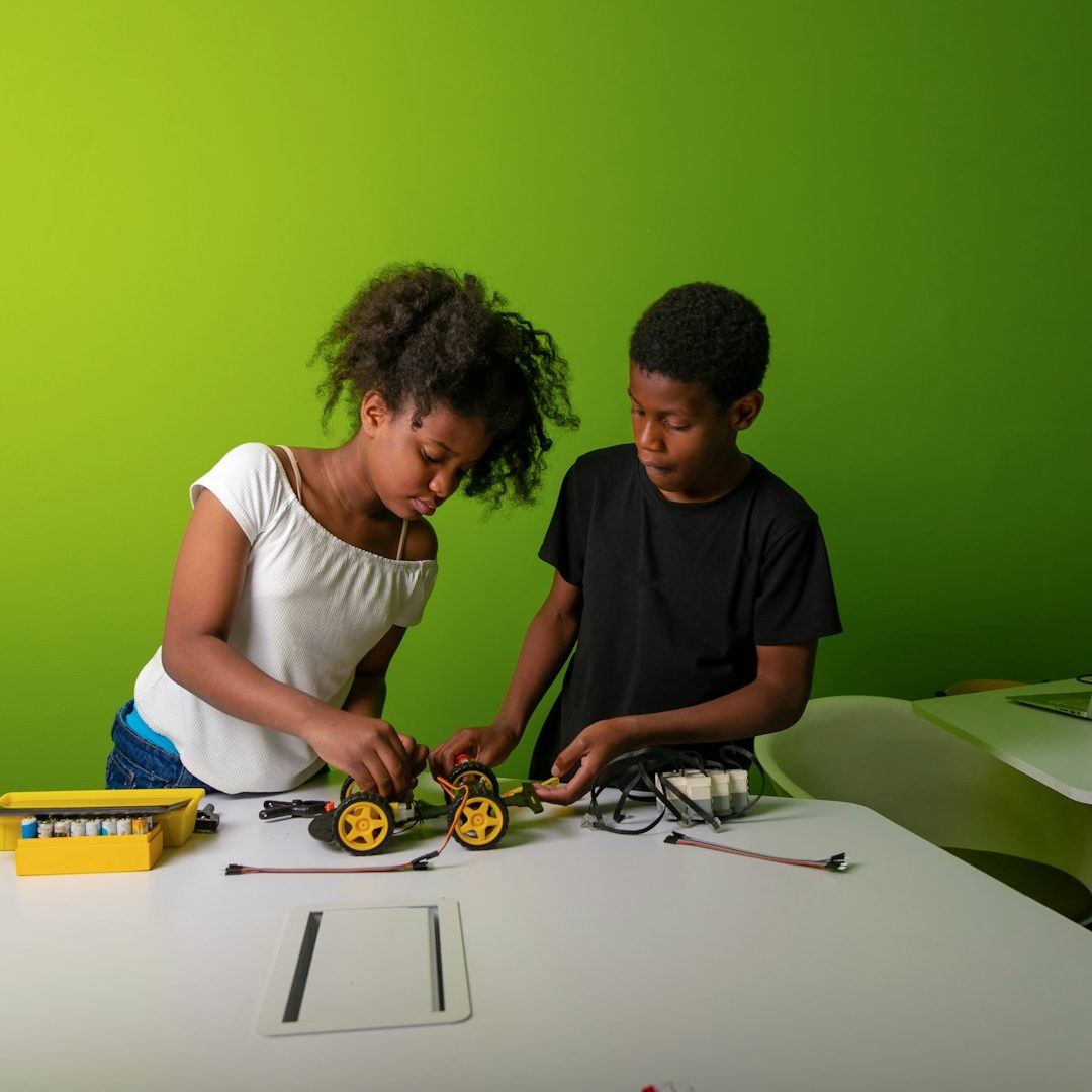 Children build walking robots and learn circuits to improve technical and fine motor skills.